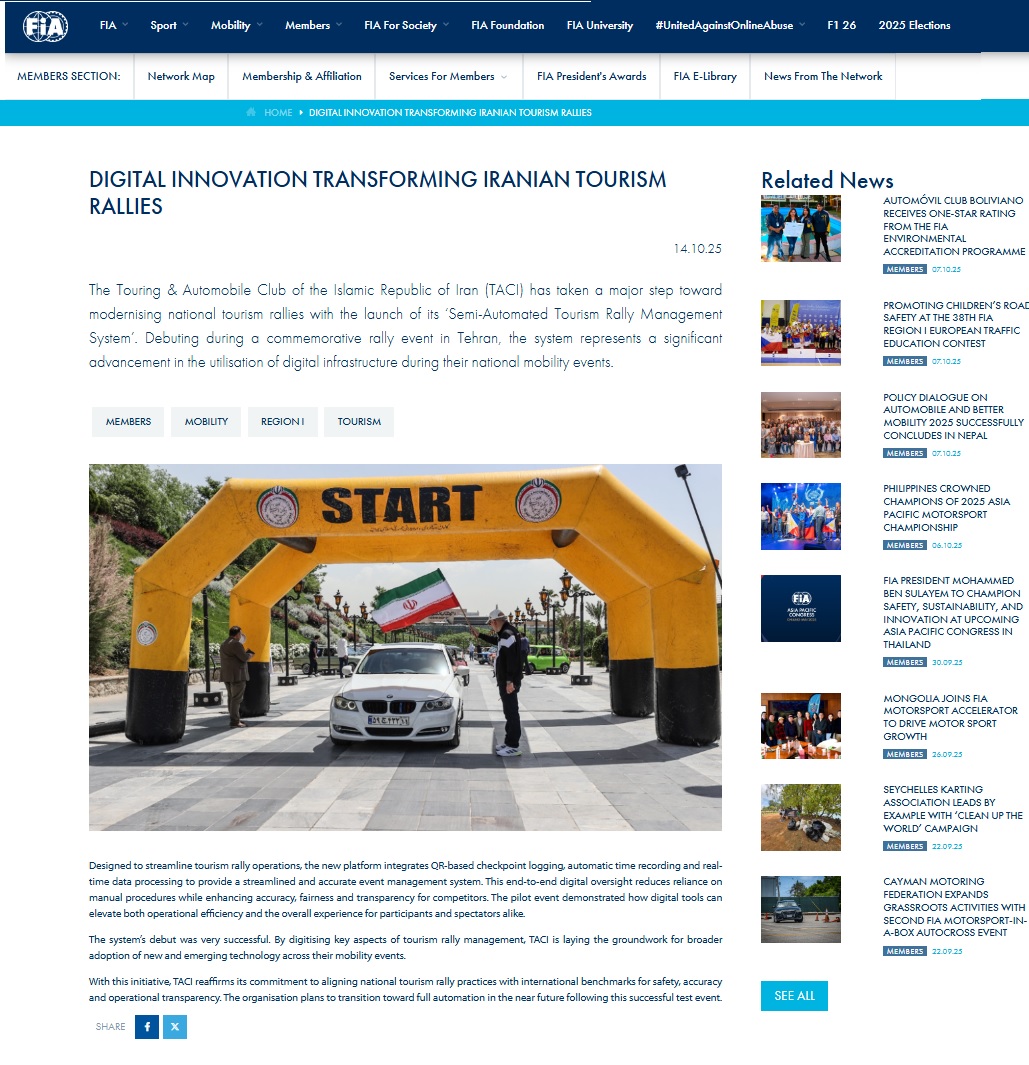 وب سایت رسمی فدراسیون بینالمللی اتومبیلرانی (FIA) در گزارشی کامل به اقدام کانون جهانگردی و اتومبیلرانی جمهوری اسلامی ایران در زمینه استفاده از فنآوریهای نوین در حوزه داوری رالی تورهای گردشگری پرداخته است.
