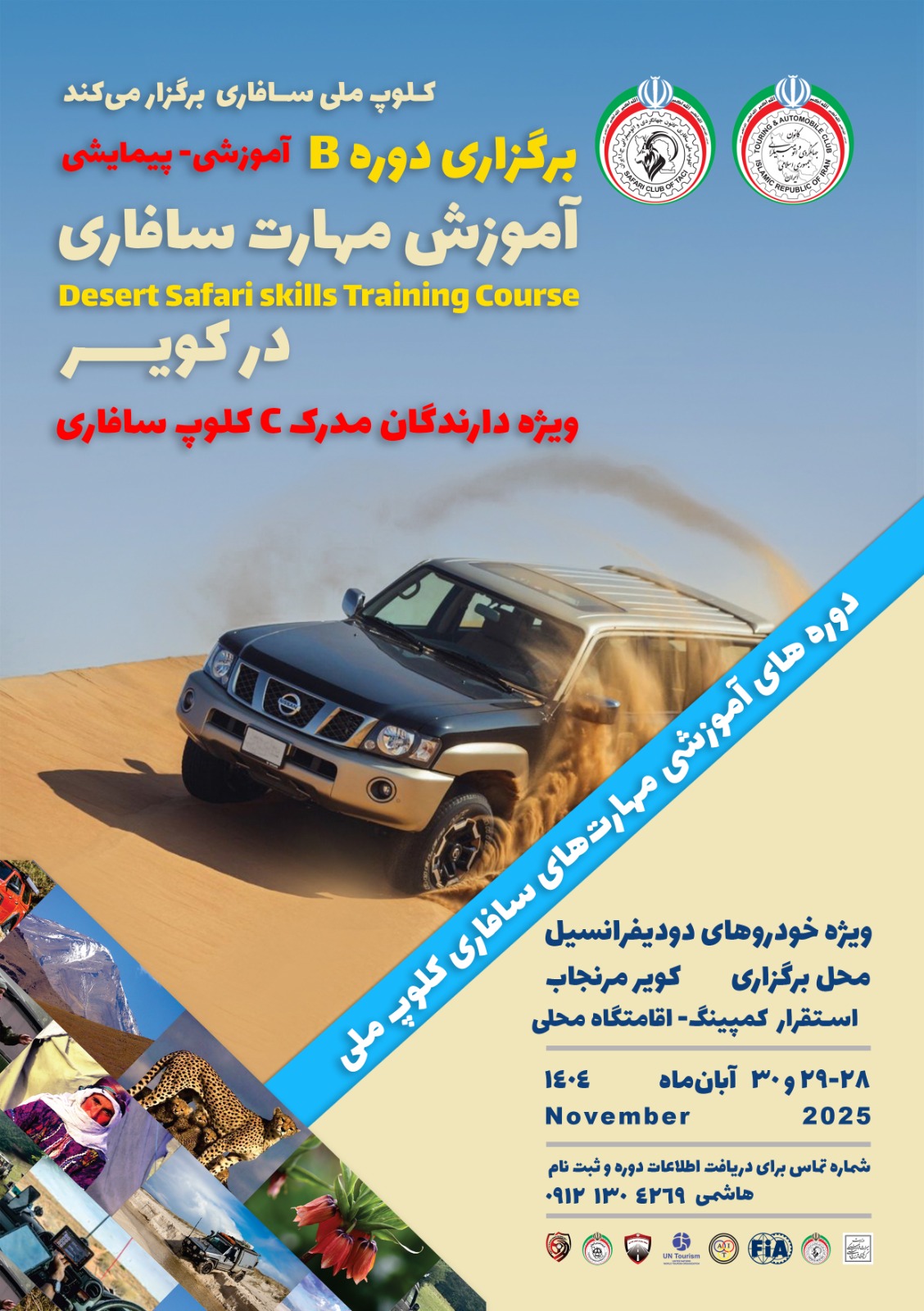 دوره B آموزشی- پیمایشی مهارتهای سافاری در کویر از سوی کلوپ ملی سافاری کانون جهانگردی و اتومبیلرانی ویژه دارندگان مدرک درجه C کلوپ ملی سافاری برگزار میشود.